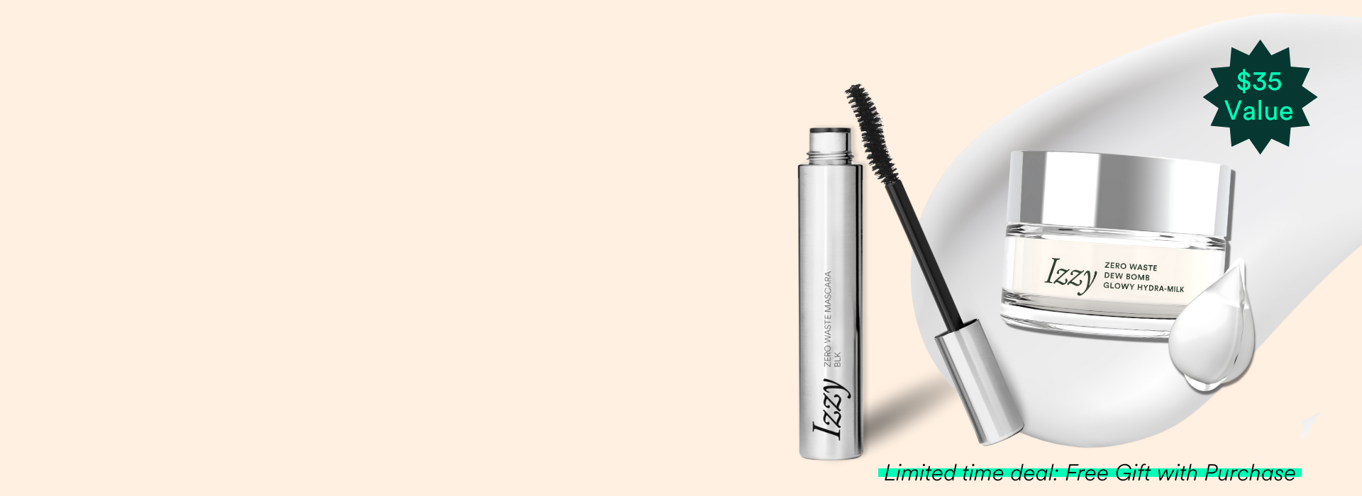 Izzy beauty products are shipped in reusable mailers made from upcycled materials, meaning there’s no outer packaging.