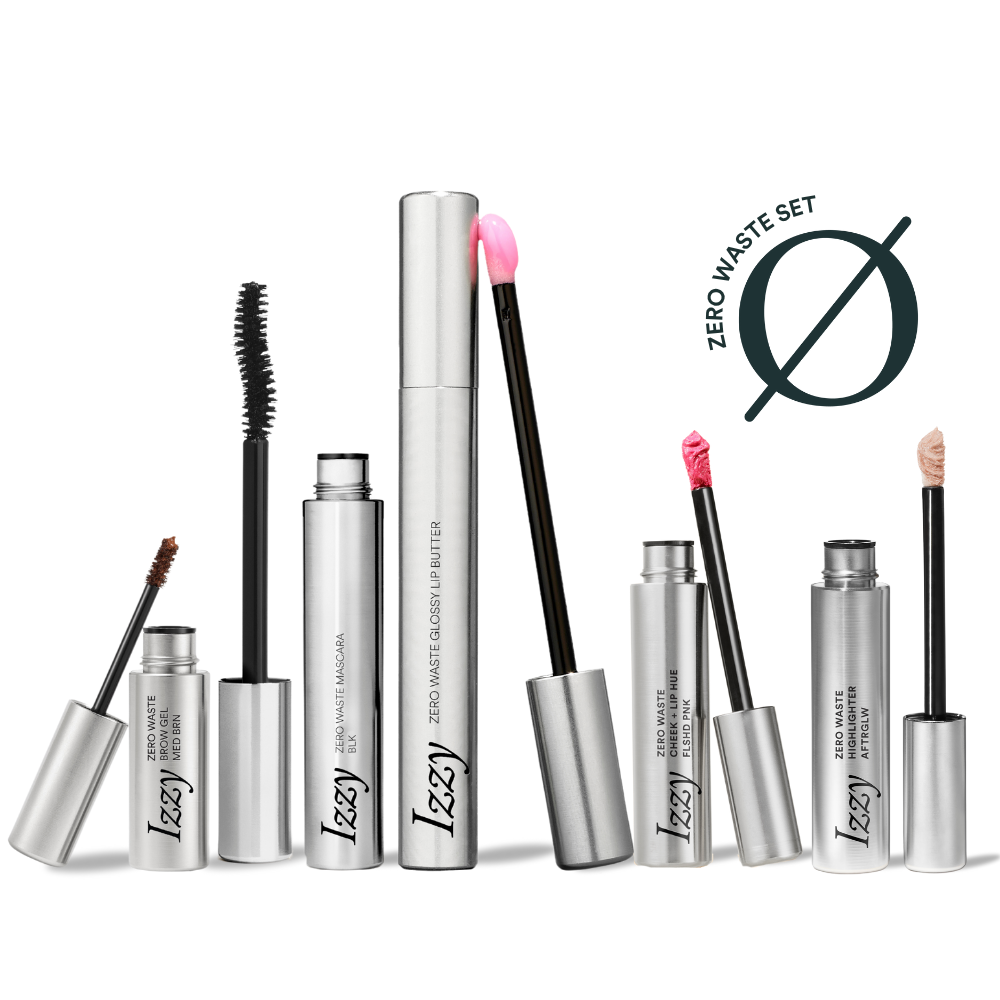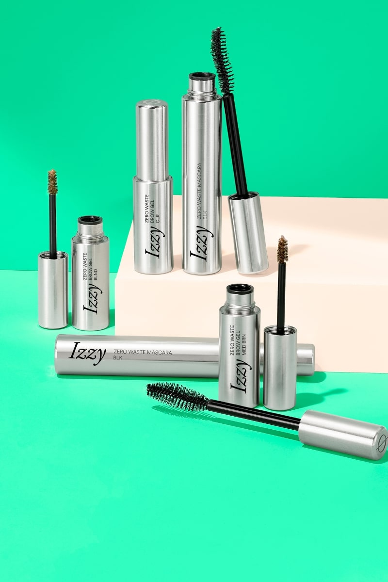 Izzy beauty products are shipped in reusable mailers made from upcycled materials, meaning there’s no outer packaging.