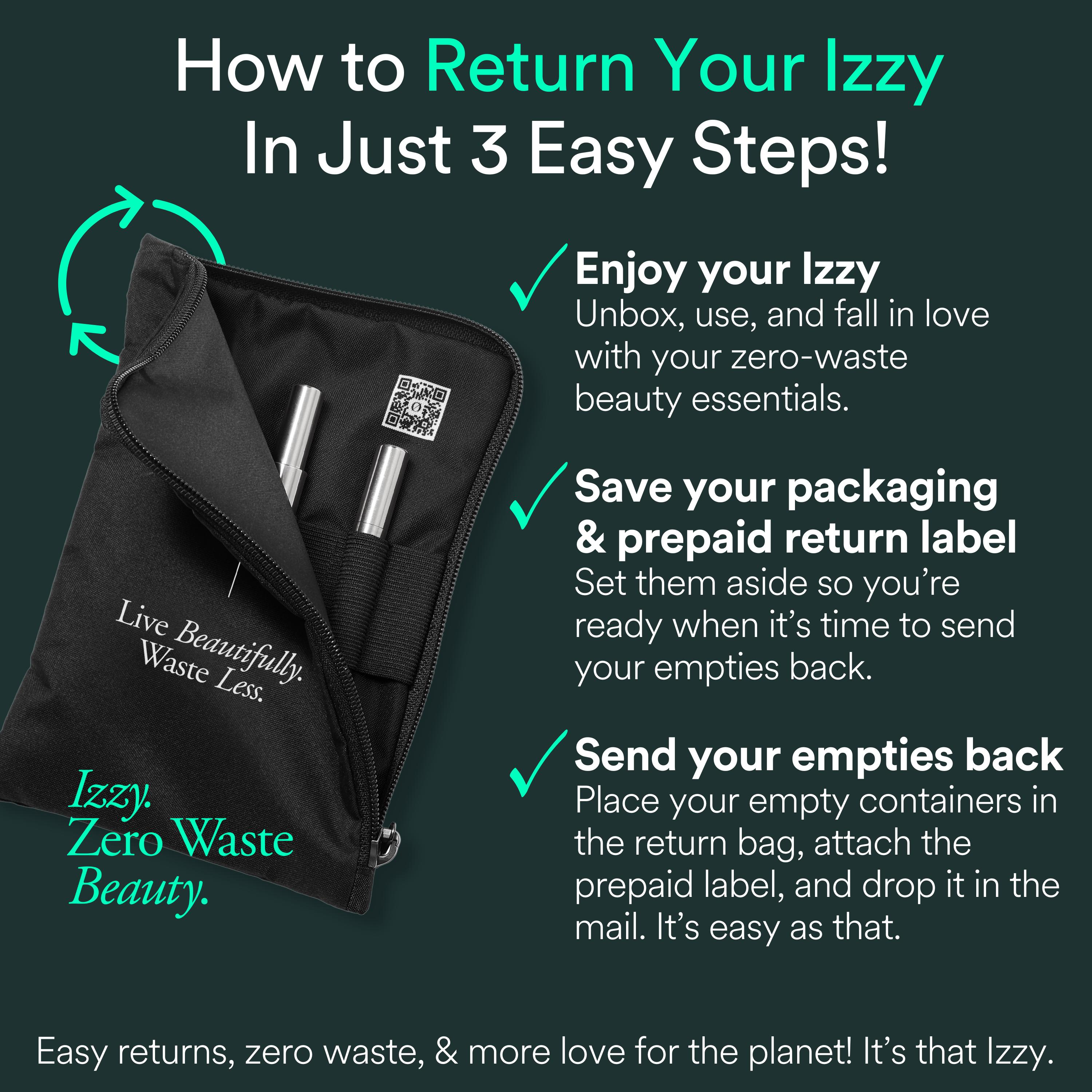 Izzy is committed to a sustainable, closed-loop system. The $8 shipping charge covers: