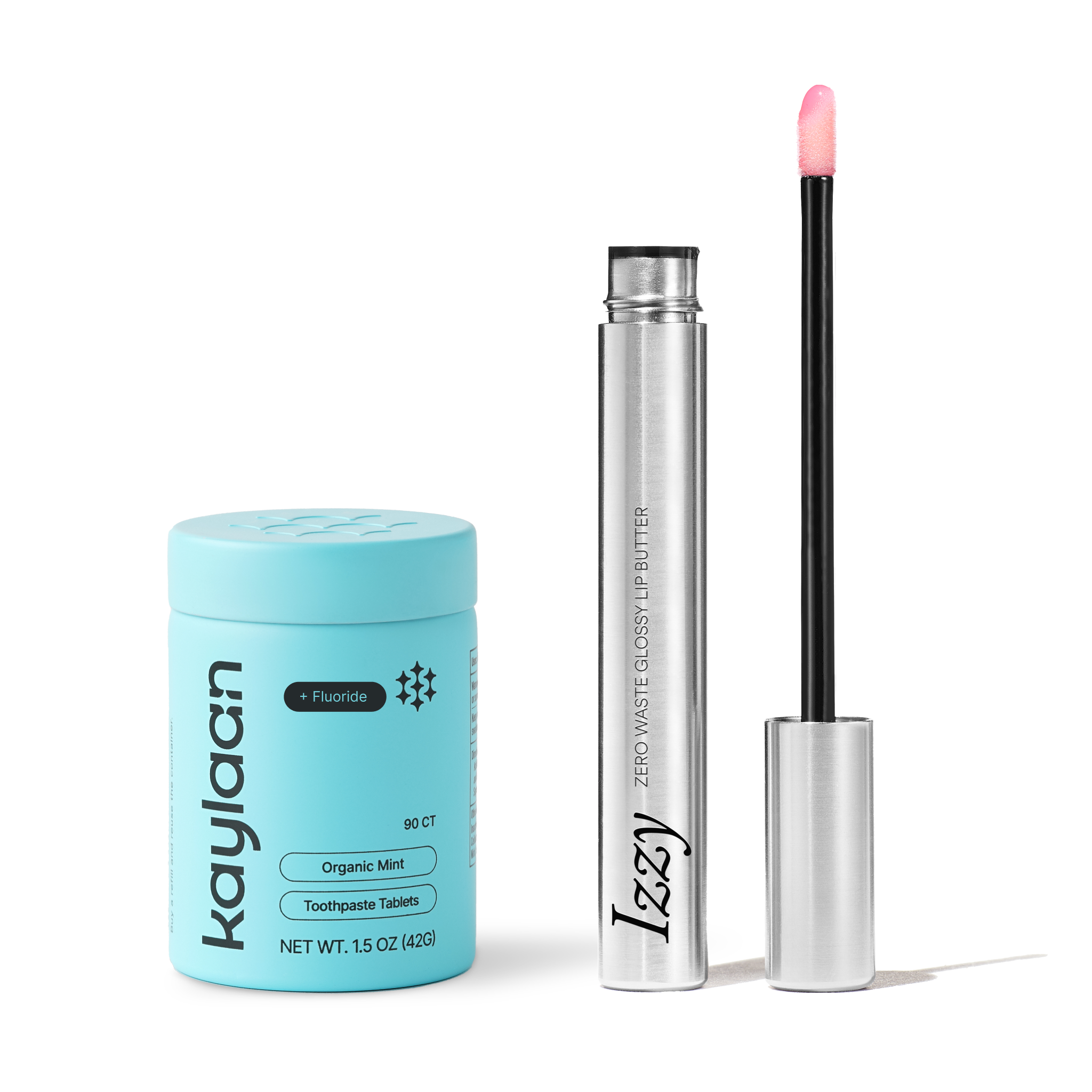 Fresh breath and hydrated lips wherever you go. Kaylaan Organic Mint Toothpaste Tablets deliver a refreshing clean, while Izzy’s Zero-Waste Glossy Lip Butter hydrates lips with a subtle universal tint. Two sustainable essentials for fresh breath and soft lips.